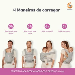 - 4 (Quatro)posições de transporte – voltado para dentro (0m+), voltado para fora (5m+), transporte no quadril (6m+) e transporte nas costas (6m+)