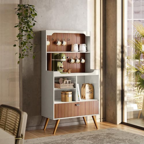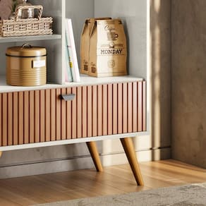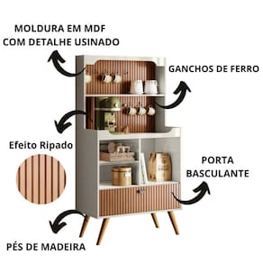 Cantinho do Café Rubi - é ideal para sua Cozinha! Com designer Retrô ele irá agregar muito mais charme e requinte ao seu ambiente. Possui o Efeito Ripado Em Tauari, com porta basculante, gancho de ferro e prateleiras para armazenamento. Amplo tampo para acomodar seus objetos de decoração, xícaras etc. Elaborado em MDF usinado com pés em madeira maciça, esses atributos garantem ao produto maior resistência e durabilidade.