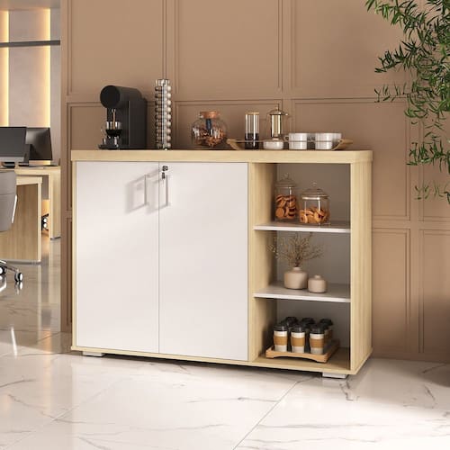 O tampo amplo acomoda cafeteira, cápsulas e utensílios com praticidade, enquanto o armário com portas mantém tudo organizado e discreto. Os nichos laterais abertos valorizam a decoração e facilitam o acesso a copos, xícaras e itens de uso diário.