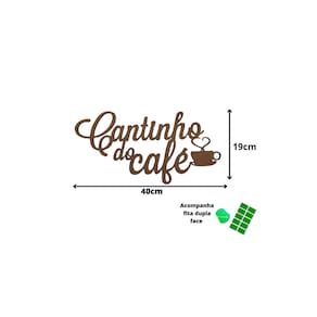 Para decorar aquele cantinho do café, dando uma cara personalizada e agradável ao ambiente. 1 placa (aplique) #CantinhadoCafé com 3mm de espessura e medida de 40x20cm. Corte realizado a laser. A placa já vai com fita dupla face para fixação, basta retirar e aplicar na parede, não é necessário furar. Além da parede, também pode ser aplicado em azulejos, madeiras, vidros, móveis, geladeiras, portas, etc. Limpeza deve ser efetuada com pano seco ou úmido.