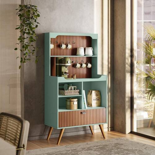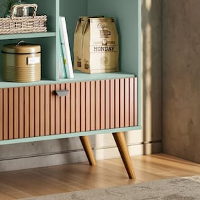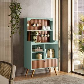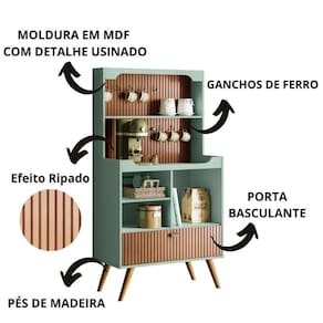 Transforme seu ambiente com o Cantinho do Café Rubi, um móvel sofisticado e funcional, perfeito para dar um toque retrô e requintado à sua cozinha ou espaço gourmet. Seu efeito ripado em Tauari traz um charme exclusivo, enquanto a porta basculante, ganchos de ferro e prateleiras proporcionam ótima organização para utensílios, xícaras e objetos decorativos. Produzido em MDF usinado e com pés em madeira maciça, garante durabilidade e resistência, tornando-se o complemento ideal para um cantinho do café elegante e funcional.