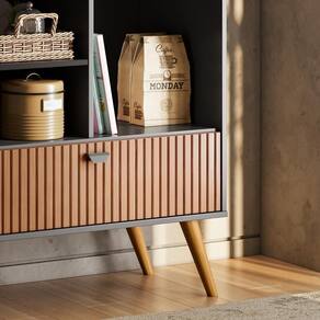 Transforme seu ambiente com o Cantinho do Café Rubi, um móvel sofisticado e funcional, perfeito para dar um toque retrô e requintado à sua cozinha ou espaço gourmet. Seu efeito ripado em Tauari traz um charme exclusivo, enquanto a porta basculante, ganchos de ferro e prateleiras proporcionam ótima organização para utensílios, xícaras e objetos decorativos. Produzido em MDF usinado e com pés em madeira maciça, garante durabilidade e resistência, tornando-se o complemento ideal para um cantinho do café elegante e funcional.