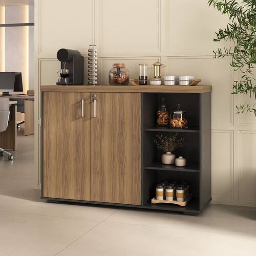 Seu tampo amplo acomoda cafeteira, cápsulas e utensílios com praticidade, enquanto o armário com portas mantém tudo organizado e discreto. Os nichos laterais abertos valorizam a decoração e facilitam o acesso a copos, xícaras e itens de uso diário.