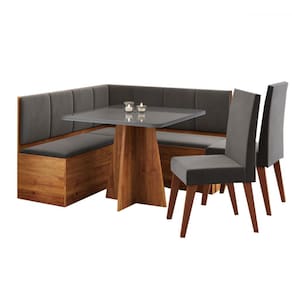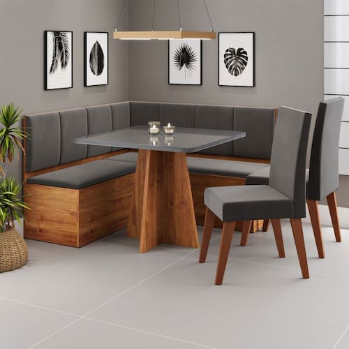 O(a) Canto Alemão Gourmet com 2 Caderias Marrom/Cinza/Veludo Cinza - Viero Móveis é produzido em MDF, MDP e Eucalipto na escala de brilho Semi-Brilho, e possui um grau de dificuldade de montagem: Médio.