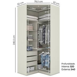 Modulado Seletto é completo e foi desenvolvido para atender as mais diversas necessidades de uso e espaço, várias possibilidades de combinações casal ou solteiro. Canto Closet Modulado 2 Portas 3 Gavetas. Estrutura em MDP de 15mm e Portas em MDF/BP de 15mm (fundo com 3mm), portas com dobradiças metálicas 35 mm com amortecimento e ângulo de abertura da porta de 135 graus maior do que as dobradiças convencionais facilitando o acesso ao interior do closet, gavetas com corrediças telescópicas suportando 3 kg cada, total de 5 prateleiras suportando até 8 kg cada, conta com cabideiro e calceiro de alumínio, iluminação em LED que é acionada automaticamente com a abertura da porta, puxadores de alça em alumínio na cor bronze. Este móvel chegará na sua casa separado em 4 volumes.