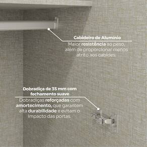 Diferenciais: Puxador em alumínio, dobradiças metálicas, corrediças telescópicas, cabideiro de alumínio, iluminação Led.