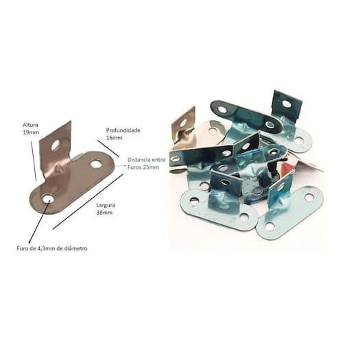Cantoneira Para Fixar Moveis 3 Furos Contém pacote com 50 Peças em inoxAs peças em inox tem maior durabilidade e esse suporte pode ser utilizado para marcenaria em geral na fixação de moveis, prateleiras, nichos e outros.Nossas mercadorias acompanham nota fiscal do produto .-----------------------------------------------------------------------------------------------------Dados técnicos (vide também fotos)Largura parte Maior: 38mmEntre furos: 25mmProfundidade: 16mmAltura: 19mmLargura aba de um furo: 15mmEspessura: 0,7 mmContem 50 unidadesMaterial: inox 430Peça com película dos dois lados