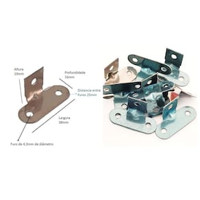 Especificações Técnicas Largura parte Maior: 38mm Entre furos: 25mm Profundidade: 16mm Altura: 19mm Largura aba de um furo: 15mm Espessura: 0,7 mm Unidades: 100 peças