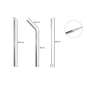 CARACTERÍSTICAS: Medidas: Largura 0,5 cm x Altura 21,5 cm Material: Aço Inox Peso: 100 gramas Contém: 4 canudos dois retos e dois curvos e 1 escovinha de limpeza Marca: Topen Home