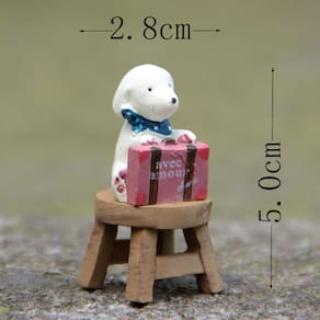 Material: Resina Tamanho: consulte a imagem Peso: 30 g ['Charmosa escultura de cachorro: esta deliciosa estatueta de resina para cães está sentada em um banquinho de madeira, segurando uma caixa de presente colorida com as palavras “avec amour”, adicionando um toque adorável a qualquer ambiente. ', 'Perfeita para uso externo e interno: ideal para jardins, pátios ou decoração de casa, esta linda escultura de cachorro traz calor e charme ao seu espaço, seja por dentro ou por fora. ', 'Material de resina durável: feita de resina de alta qualidade, esta estátua foi projetada para resistir às condições externas, mantendo cores e detalhes vibrantes ao longo do tempo. ', 'Design exclusivo e divertido: o doce cachorro com seu laço azul e caixa de presente cria uma atmosfera emocionante, tornando-o uma peça decorativa perfeita para amantes e colecionadores de cães. ', 'Decoração versátil: seja exibida em seu jardim, sala de estar ou como parte da decoração de sua casa, essa figura caprichosa de cachorro adiciona personalidade e personalidade a qualquer espaço']