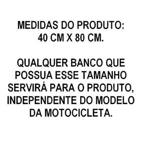 Descrição: - Não esquenta; - Permite a circulação do ar; - Impermeável; - Material anatômico; - Anti derrapante; - Material ; - Fácil instalação; - Compatível com bancos de várias motos. - A capa é instalada em cima da capa existente sem danificá-la e é presa através de uma faixa de fixação. As vantagens de se ter uma rede de nylon dupla camada são: 1 Impermeabilidade, pois ela molhando ela não retém água, além de ser durável, fácil de instalar e segura para uso, fresca, seca e confortável para os pilotos. 2 Permeabilidade ao ar pois o seu formato como rede permite maior circulação do ar. 3 Isolamento contra aquecimento solar o que permite que se sente na moto mesmo que ela esteja parada no sol pois o banco não estará quente. Não precisa tirar a capa do banco de sua moto, ela vai por cima encaixando-se com perfeição em qualquer tipo de banco por meio de cintas de fixação, qualquer pessoa pode fazer o serviço, necessitando somente retirar o banco da moto para fazer a instalação. Medidas aproximadas: Comprimento máximo: 80 cm Largura máxima: 37 cm. Marca: Não Informado Ean: 7907291390458