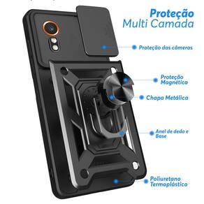 Capa protetora blindada com suporte metálico giratório 360º e tampa deslizante para lente. Proteção reforçada antichoque e anti-impacto. Design moderno e funcional com firmeza na pegada. Acessibilidade completa com recortes precisos.Tipo