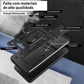 Alta proteção com alto relevo na câmera, dupla resistência anti impacto, anel de dedo com metal para aderir em imã, anel ajustável para função de base, encaixe perfeito, slide cover para proteção das câmeras e privacidade. Não suporta carregamento por indução.Características