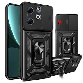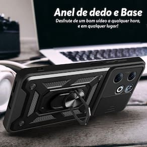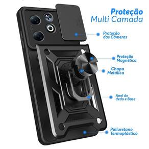 Capa protetora blindada com suporte metálico giratório 360º e tampa deslizante para lente. Estrutura robusta em camadas que absorve impactos, ideal para quedas e uso diário intenso. Protege as câmeras contra arranhões, poeira e sujeira. Funciona como apoio de mesa para vídeos e chamadas, além de ser compatível com suporte magnético veicular. Design moderno e funcional com detalhes em relevo. Encaixe preciso com recortes para botões, entradas e câmera.Tipo
