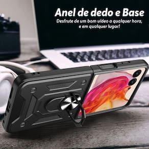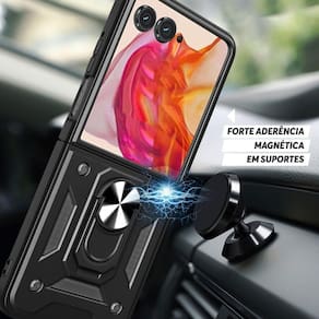 Capa protetora blindada com suporte giratório 360º e tampa deslizante para lente. Proteção reforçada antichoque e anti-impacto. Compatível com suporte magnético veicular.Tipo