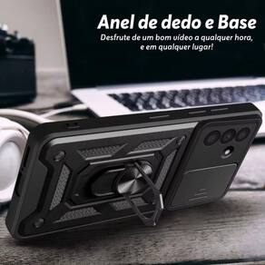 Alta proteção com alto relevo na parte que protege a câmera; proteção anti impacto de dupla camada; anel de dedo e metal imbutido para aderir em imã; anel ajustável para função de base; slide cover para maior proteção das câmeras e maior privacidade; não suporta carregamento por indução.Características