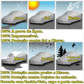 Características e benefícios: - Protege a pintura contra riscos. - Capa 100% impermeável. - Adequada para garagens descobertas ou cobertas. - Protege seu carro por inteiro. - Instalação prática e fácil. - Elástico interno para melhor fixação. - Proteção contra raios uv, chuva, poeira, sujeiras, animais. - Reflete luz solar. - Leve e resistente.