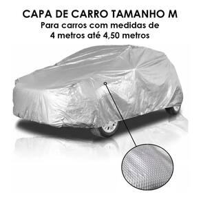 a capa para carro é essencial para quem tem mais de um carro na garagem ou tem apenas um carro e só usa nos fins de semana, já que o trânsito das cidades está a cada dia mais caótico. Com a capa automotiva seu carro poderá ficar protegido dos danos da chuva, chuva ácida, sol, poeira, neblina, riscos e arranhões. A capa com forro inclui uma proteção extra contra o sol e chuva, podendo ser utilizado em garagem coberta ou descoberta. As capas automotivas são fabricadas em polietileno trançado peva que possui proteção u. V que é um material térmico e tem a cor prata que ajuda a dissipar o calor, elas tem proteção interna de polipropileno que possui um tratamento anti-risco, ideais para pessoas que moram em apartamentos, condomínios ou deixam o carro em estacionamentos de terceiros que são lugares com maior índice de por atos de vandalismo. As capas para carro possuem sistema interno de ventilação que faz com que o ar circule embaixo da capa, para evitar que fique umidade entre a capa e a pintura do carro, são super resistente e anti-mofo, leves de fácil manuseio e transporte, pois qualquer pessoa pode colocar e retirar a capa a qualquer hora sem nenhum esforço. Fabricado em polietileno. Cor prata. Especificações técnicas