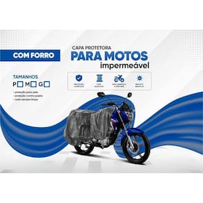 Capa Cobrir Moto Tamanho P com Forro A Capa Protetora para Moto Com Forro Tamanho P é a solução ideal para proteger sua motocicleta contra diversos elementos climáticos e sujeiras. Fabricada com materiais de alta qualidade, esta capa oferece proteção completa contra chuva, poeira, raios UV e muito mais, mantendo sua moto sempre limpa e com a pintura preservada. Especificações do Produto: Modelo: Capa Protetora para Moto Impermeável Com Forro Material: Material Impermeável de Alta Qualidade com Forro Tamanho: P para motos pequenas Peso Aproximado: 1 kg Itens Inclusos na Embalagem: 1 Capa Protetora para Moto Tamanho P Características: Proteção Completa: Protege a moto contra chuva, poeira, raios UV, folhas e excrementos de pássaros. Material Impermeável: Garante que a água não penetre, mantendo a moto seca. Resistente ao Sol: Protege a pintura da moto contra os raios UV, evitando desbotamento. Durabilidade: Feita com materiais de alta qualidade para maior durabilidade. Ajuste Perfeito: Equipada com elásticos ou cordões ajustáveis para garantir um ajuste firme, mesmo em dias de vento. Ventilação: Possui aberturas para ventilação, evitando a formação de mofo e bolor. Proteção para Pets: Evita arranhões e danos causados por animais de estimação. Não Danifica a Pintura: Material suave que não risca a pintura da moto. Reflete Raios UV: Protege a moto contra os danos causados pelo sol. Modelos Compatíveis Tamanho P : Dafra: Citycom 100, Kansas 150, Speed150, Super 50/100, Zig, Apache 150, Smart 125 Honda: Biz, CBX200/250, CG 125/150 Titan, CG125/150, CG125 Cargo, Lead 110, Pop 100 Sundown: Future, Future Sport, Hunter, Hunter 100, Max SE/SED, Motard 125 CC, Web, Web Evo Suzuki: Burgman, Intruder 125 ED/Cargo, Yes 125 ED/Cargo : Crypton, Factor YBR 125, Factor YS 250, Neo, YBR 125 Como Usar: Escolha o Tamanho Correto: Verifique as dimensões da sua moto e escolha uma capa que se ajuste bem a ela. Colocação: Comece pela parte dianteira da moto e vá estendendo a capa até cobrir completamente. Ajuste: Certifique-se de que todos os lados estejam bem ajustados e que os elásticos ou cordões estejam bem presos. Remoção: Retire a capa começando pela parte traseira e dobre-a cuidadosamente para armazenamento. Dicas de Manutenção: Limpeza: Lave a capa periodicamente com água e sabão neutro para mantê-la limpa e livre de odores. Armazenamento: Guarde a capa em um local seco e longe da luz solar direta quando não estiver em uso para preservar sua durabilidade. Transforme a proteção da sua moto com a Capa Protetora para Moto Com Forro Tamanho P e mantenha seu veículo sempre em ótimo estado Destaques do Produto Proteção completa contra intempéries e sujeiras Material impermeável e resistente ao sol Ajuste perfeito para motos pequenas Fácil de colocar e remover Versatilidade para uso interno e externo Durabilidade e alta qualidade Ideal para motos como Honda Biz, CG 125, YBR 125 e outras