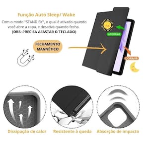 - recursos como fechamento magnético: Para maior segurança, dissipação de calor para evitar superaquecimento e absorção de impacto para proteger seu tablet de danos, você pode se sentir confortável e confiante em qualquer situação. Além disso, a função autosleep economiza energia, desligando automaticamente o teclado quando não estiver em uso.