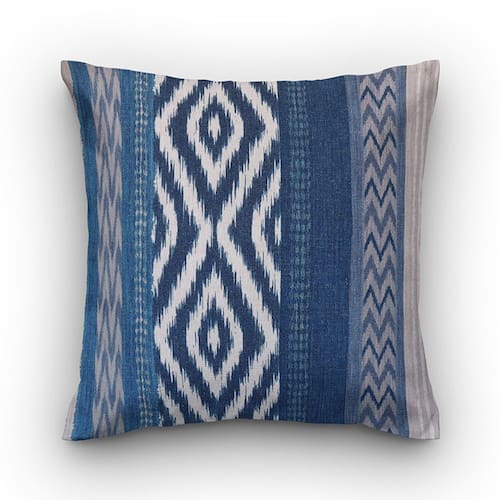 Linho estampa ikat azul com cinza Tecido: 81% poliéster e 19% linho Acabamento: Zíper invisível Tamanho: 45 x 45 cm Enchimento para esta capa: 50 x 50 cm não incluso As cores podem sofrer alterações conforme a configuração de sua tela Marca: Vivain Ean: 7908245201981