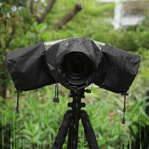 Proteja sua câmera fotográfica DSLR contra chuva e respingos com a capa de chuva RV-66 da Greika. Ela é confeccionada em nylon impermeável e possui duas mangas laterais ajustáveis para as mãos, permitindo manusear a câmera com conforto. A parte traseira é feita em plástico transparente, que permite visualizar a tela LCD e os controles da câmera.