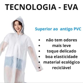 Capa de Chuva 100% EVA Resistente, perfeita para todas as ocasiões. Mantenha as mãos livres, seus pertences a salvo da água da chuva com esta capa protetora resistente. Ideal para utilizar em: Passeios, Eventos Esportivos, Fácil de carregar.
