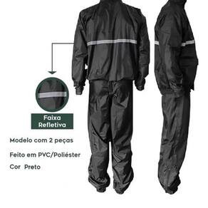 Material: PVC e poliéster impermeáveis. Jaqueta: Com capuz e proteção extra sobre o zíper. Calça: Modelagem confortável para liberdade de movimento. Forro: Malha 100% poliéster para maior conforto. Cor: Preta. Tamanho único.