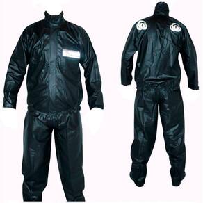 - Calça: confeccionada em tecido sintético plastificado em PVC com forro, costura por solda eletrônica, elástico na cintura, zíper nas barras para ajuste.