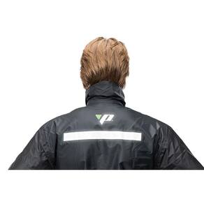 Jaqueta com bolso interno, cintura ajustada com elástico regulador, punhos com elástico e fechamento frontal com zíper e tiras autocolantes. Refletivo nas costas e na barra da calça. Com gola.
