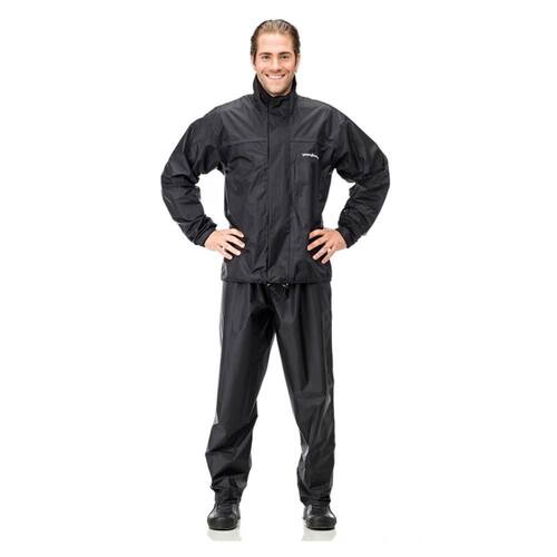 Um conjunto formado por jaqueta e calça tamanho GG, ambos com refletivos de segurança e fabricados em nylon de 0,19 mm.
