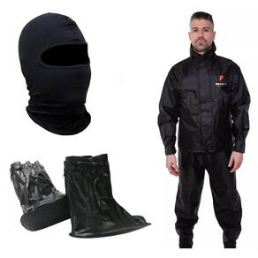itens inclusos: 01 jaqueta sem capuz - 01 calça - 01 balaclava marca fabricante capa de chuva: pioneira marca fabricante polaina: piracapas marca fabricante balaclava: dvsc modelo: nylon urban descrição: - confeccionado em nylon emborrachado 0,20mm - jaqueta com fechamento através de zíper e fecho recobertos por uma lapela de drenagem - gola alta - regulador nos punhos em fecho - p refletivo nas costas. - a calça conta com elástico na cintura e regulador em fecho na bainha da calça