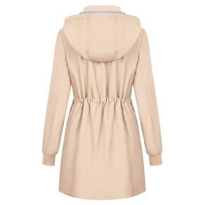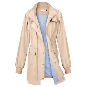 Casacos de chuva femininos impermeáveis com capuz - ?Design de capa de chuva?? Cordão ajustável oculto na cintura melhora a estética do corpo ? O design moderno do forro listrado vertical faz você parecer muito magra e chique ?Dois bolsos frontais com botões garantem que os itens não caiam. ?Punhos elásticos de manga comprida e design de capuz de gola alta melhoram a resistência ao vento ?Longo o suficiente para cobrir seu quadril. O capuz removível cria 2 visuais completamente diferentes e pode ser parcialmente limpo durante o processo de limpeza para prolongar sua vida útil - ?Material da capa de chuva?Revestimento 100% poliéster e forro 100% algodão. Impermeável / leve / secagem rápida / à prova de vento / respirável / impermeável / confortável de usar. Pode ser embalado em uma pequena bolsa compacta que é fácil de ser transportada em sua mochila diária e perfeita para viagens ou uso casual, e também reduz o consumo de energia no corpo. - ?Ocasiões?O tecido de poliéster tem uma densidade maior e pode ser mantido seco a qualquer momento. Não é facilmente penetrado por chuva leve ou neve, mas não fique muito tempo na chuva forte. Este sobretudo é adequado para uso diário, acampamento, caminhada, equitação, ciclismo, escalada, piquenique, caminhadas, viagens, passear com o cachorro, assistir a jogos de bola e outras atividades e esportes ao ar livre. - ?Cuidados com as capas de chuva femininas?Lavar à mão em baixa temperatura. Recomenda-se lavar a seco. Lavar à máquina facilmente danifica o tecido impermeável. - ?Aviso sobre o tamanho? Esta capa de chuva feminina é casual e grande o suficiente, fica grande para mulheres pequenas, escolha um tamanho abaixo se você for magra. O modelo na imagem tem 175 cm e 52 kg. O tamanho dela é pequeno.