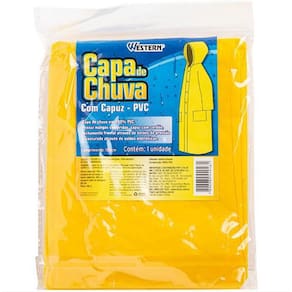 Capa de chuva em 100% pcv. Item indispensável para os dias de chuva. Possui mangas compridas, capuz, fechamento frontal através de botões e costurada através de saldas eletrônicas. Capa de chuva com capuz pvc adulto - dimensões da peça: Comprimento: 118cm Comprimento com capuz: 150cm Largura de um braço a outro: 168cm Largura sem as mangas: 68cm Comprimento da manga: 55cm Circunferência da manga: 25cm - dimensões da embalagem: 20 x 1,5 x 27cm - material: 100% pvc - cor: amarelo - tipo de embalagem: saco plástico - marca: western - origem: china - contém: 1 unidade - espessura: 1mm - características: Capa de chuva em 100% pcv. Possui mangas compridas, capuz, fechamento frontal através de botões e costurada através de saldas eletrônicas. Altura aberta: 150cm Peso: 146g. - atenção: Evitar contato com material pontiagudo e de alta temperatura. - cuidados: Lavar em água fria com sabão. Não usar cloro. Secar na sombra e na vertical sem torcer. Não passar ferro ou vaporização. - : Marca: Não Informado