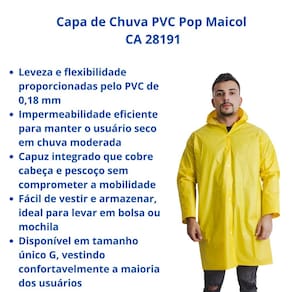 Capa de Chuva PVC Pop Amarelo Maicol CA 28191 Proteção prática e leve para dias chuvosos A capa de chuva PVC Pop é confeccionada em material PVC de alta qualidade e espessura de 0,18 mm, oferecendo leveza e flexibilidade sem abrir mão da resistência à água. Com capuz integrado, garante proteção eficiente contra chuvas moderadas em diferentes atividades ao ar livre.