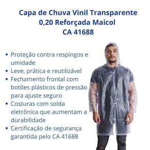 Capa de Chuva Vinil Transparente 0,20 Reforçada Obra Maicol CA 41688 A capa de vinil transparente Maicol é confeccionada em vinil laminado de alta qualidade com 0,20 mm de espessura, oferecendo proteção prática e eficiente contra respingos e umidade durante atividades com uso de água.