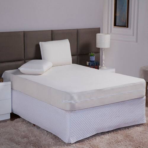 Mantenha seu colchão e travesseiros novinhos e limpos por mais tempo. As capas vestem todo o colchão e os travesseiros, têm fechamento em zíper e a malha é leve, resistente e maleável.   Contém na embalagem: 1 capa de colchão 1,88m x 1,38m x 25cm 2 capas de travesseiro 70cm x 50cm   Tecido e composição: Malha gel 100% poliéster   - Capa indicada para colchões com até 25cm de altura - Foto ilustrativa, a tonalidade da cor pode variar um pouco no produto real   Produtos fabricados em Ibitinga-SP, a Capital Nacional do Bordado e do Enxoval.
