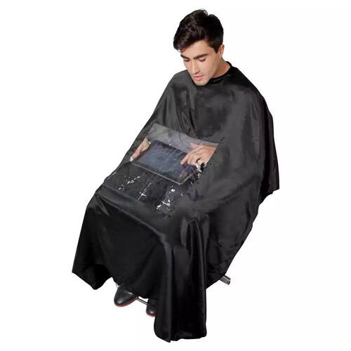 Capa de Corte Com Visor Plastico Transparente Para Celular Essa capa de Nylon possui visor plástico transparente para que o cliente possa usar aparelhos eletronicos sem o risco de danificar o aparelho com produtos liquidos. É ideal para ser usada por profissionais cabeleireiros, ela protege o cliente da pelugem de cabelos no momento do corte, usada também na hora de fazer escovas ou outros procedimentos.
