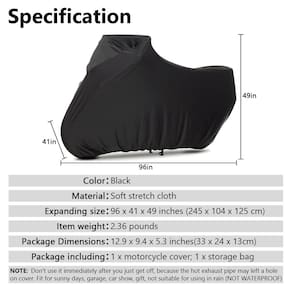 IMPORTANTE: Se for um produto elétrico, ele pode ser compatível com uma tomada de 110 volts. Se utilizado fora dos Estados Unidos, pode ser necessário um conversor de voltagem para garantir a operação adequada. Verifique se o produto que você está comprando é elétrico antes de considerar essas informações. Cor: preto Material: tecido elástico macio Tamanho expansível: 96" x 41" x 49" (245 x 104 x 125 cm) Peso do item: 2,36 libras Dimensões da embalagem: 12,9 x 9,4 x 5,3 polegadas (33 x 24 x 13 cm) O pacote inclui: 1 x capa de motocicleta; 1 x bolsa de armazenamento - Montagem: a capa de motocicleta BIHEE tamanho interno serve para várias motocicletas de até 96" - Material de qualidade: nossa capa de moto interna Costurado com tecido de poliéster de alta elasticidade, o tecido tem boa elasticidade. Pode ser completamente restaurado através do alongamento de 15% a 20%. O material respirável evita a retenção de condensação/umidade e o risco resultante de ferrugem. - À prova de rugas: esta capa para motocicleta é feita de tecido elástico de veludo que tem uma forte elasticidade e pode mostrar perfeitamente a forma do corpo da motocicleta. A resistência a rugas é superior a outras fibras, não é fácil de enrugar, tem estabilidade dimensional e tem bom efeito de embalagem. - AMPLO USO: Nossa capa de motocicleta é adequada para locais internos, como garagens subterrâneas ou feiras de automóveis, etc. Ela pode efetivamente evitar o desbotamento da areia, da superfície da tinta e a prova de exposição, o que torna sua motocicleta brilhante e limpa como a nova, sem limpar o veículo por muito tempo. - NOTA: Este tecido elástico NÃO É IMPERMEÁVEL devido à flexibilidade e elasticidade. Não use em dias chuvosos ou ao ar livre. O tecido elástico de veludo não tem veludo, é apenas um nome científico, representando a alta elasticidade e maciez do tecido.