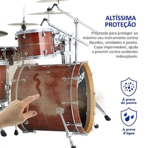 Proteje sua baterial de sujeira, poeira e umidade nocivas, bem como reflete o calor perigoso do sol e os raios ultravioleta (UV), presenvando a coloração e afinação do instrumento. As capas são reversíveis com prata reflexiva ou preta para obscurecer o equipamento do público, se for o caso. Feito com poliéster durável com revestimento acrílico. Acabamento de primeira qualidade. Resistente à água e pode ser facilmente limpo com um pano úmido. Cada canto é reforçado e ponderado para estabilidade e fácil dobragem. Além disso, está incluído ilhóis nos cantos para prender a capa, se necessário. Cobre a bateria de forma discreta, seja no placo, na igreja ou até em casa, pois as duas faces, uma preta e outra prateada, combinam com diversos ambientes. O lado prateado desta capa é feito de material reflexivo projetado para manter suas baterias frescas e seguras. Fácil de guardar, fácil de limpar. Para guardar, dobre facilmente a capa compacta o suficiente para levar com você na estrada. Para limpar, basta usar um pano úmido.