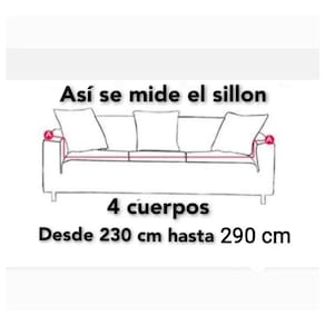 Use a capa de sofá de tecido elástico texturizado CUADRILLE, para um silão GRANDE de 3 corpos medindo entre 230 cm e 290 cm, com uma altura de 90 cm. Esta capa de 4 corpos é ideal para essa medida... Você precisa medir o Sillon de acordo com a imagem publicada. Esta capa é de excelente qualidade e fácil de lavar. Ideal para proteger seu sofá e renovar sua aparência, sem a necessidade de estofar... Grande variedade de cores