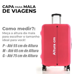 Material: suplex elástico, lavável e resistente Fechamento: fecho tipo click Cores Disponíveis: Preta, Azul, Cinza e Rosa Tamanhos e medidas aproximadas (altura x largura): P: 49 cm x 33 cm - indicado para malas de até 15 kg M: 58 cm x 37 cm - indicado para malas de 15 a 17 kg G: 65 cm x 47 cm - indicado para malas de 18 a 24 kg
