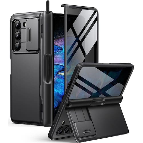 BERFY Capa para Z Fold 5 com protetor de tela de privacidade, suporte embutido para caneta S Pen, suporte oculto e capa de câmera deslizante, capa de celular fina à prova de choque para Samsung Galaxy Z Fold 5, preta