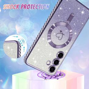 Capa com glitter, suporte magnético Magsafe, proteção da câmera e cantos anti-choque.Acabamento do material