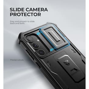 Capa de telefone à prova de choque de grau militar com moldura de TPU e capa traseira de policarbonato de camada dupla. Proteção de nível militar de 3 metros. Borracha elevada nos quatro cantos para absorção de choques. Possui capa de câmera deslizante à prova de poeira com travas fixas e deslizador elevado de 2 mm para proteção da lente. Inclui duas molduras frontais (uma com protetor de tela integrado e outra sem). Suporta desbloqueio de impressões digitais. Possui suporte dobrável embutido para visualização em modo retrato ou paisagem. Recortes precisos para acesso a portas, botões e câmera.Tipo