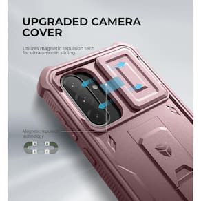 Capa resistente à prova de choque com moldura de TPU e policarbonato, capa de câmera deslizante com repulsão magnética, 2 molduras frontais extras (1 com protetor de tela integrado, 1 sem), suporte dobrável embutido, recortes precisos.Tipo