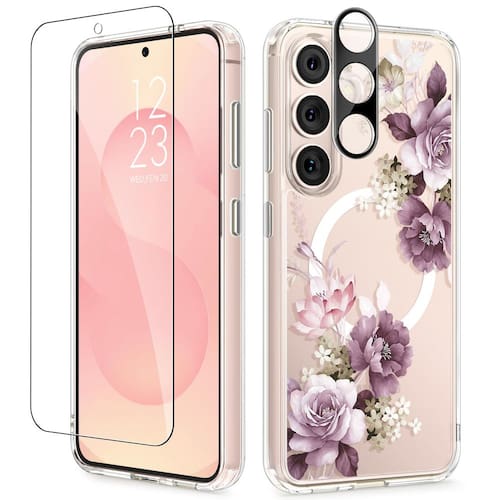 CapaGVIEWIN Capa para Samsung Galaxy S25 Plus compatível com MagSafe, com protetor de tela e protetor de lente de câmera, floral, transparente, rígida, à prova de choque, capa de telefone feminina para S25 Plus de 6,7 polegadas (flores de cerejeira) - Compatibilidade: esta capa é compatível apenas com Samsung Galaxy S25 Plus (6,7 polegadas, versão 2025); alinhamento preciso permite fácil acesso aos botões, alto-falantes e porta de carregamento; o pacote inclui uma capa floral transparente, 1 película de vidro temperado, 1 protetor de lente; confirme o modelo antes de fazer o pedido (veja a imagem 2) - Forte potência magnética: os ímãs poderosos integrados fornecem uma fixação segura com 1500 g de força, garantindo carregamento sem fio rápido e estável; Desfrute de um acessório magnético seguro e sem esforço que é perfeitamente compatível com acessórios MagSafe, como carregadores magnéticos, suportes de carro, carteiras, etc - Padrões florais claros e chiques: a capa apresenta estampas florais elegantes que dão ao seu telefone uma aparência única e atraente; o design transparente mostra a beleza autêntico do seu dispositivo; Criado com tecnologia de impressão avançada, o padrão permanece vibrante e resistente ao desbotamento ao longo do tempo - Proteção de nível militar 3 em 1 de 360°: composta por uma parte traseira rígida de policarbonato e uma moldura de TPU macio, esta capa absorve choques e resiste a quedas de até 3 metros; as molduras elevadas protegem a tela e a lente da câmera de arranhões; inclui um protetor de tela de vidro temperado 9H e um protetor de lente de câmera para fornecer proteção abrangente para o seu telefone - Durabilidade e suporte confiável: o material premium oferece resistência ao amarelamento, garantindo transparência duradoura; Para quaisquer problemas, como incompatibilidade de modelo ou expectativas não atendidas, pelo Centro de mensagens da Amazon para assistência imediata