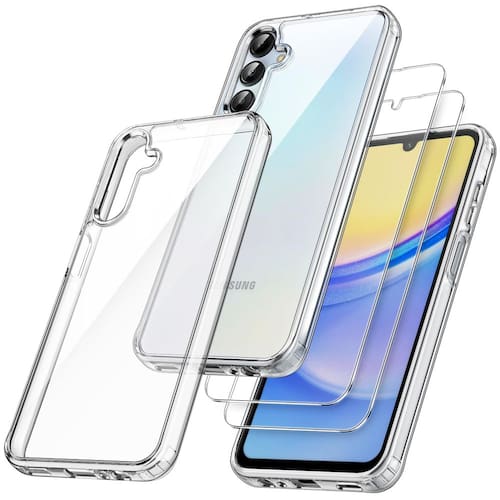 CapaCapa JeTech 3 em 1 para Samsung Galaxy A15 5G/4G de 6,5 polegadas, com 2 protetores de tela, película de vidro temperado, capa protetora de telefone à prova de choque, capa protetora de telefone transparente