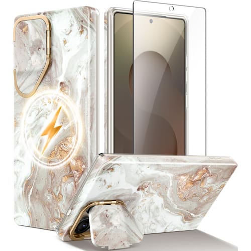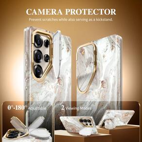 GVIEWIN Capa magnética para Samsung Galaxy S25 Ultra com suporte de capa de câmera, [compatível com MagSafe] [protetor de tela] Capa de telefone mármore com proteção contra quedas de grau mil-grade de 6,9 polegadas (perolado/dourado) - Capa de lente embutida funciona como suporte: esta capa é construída com uma capa de lente flip integrada que serve a um duplo propósito: proteger a lente da sua câmera de arranhões enquanto também funciona como um suporte de mãos livres; quando aberta, a capa da lente se transforma em um suporte multiângulo, oferecendo um ângulo de visualização perfeito para assistir a vídeos, fazer chamadas de vídeo ou desfrutar de conteúdo de mídia - Design de padrão chique: com um design elegante inspirado em mármore, esta capa de telefone se destaca com estética sofisticada; usando tecnologia avançada de estampagem, o padrão permanece vibrante e resistente ao desbotamento ao longo do tempo, garantindo que seu telefone pareça elegante e novo durante o uso frequente - Magnetismo mais forte: com um anel magnético integrado, esta capa oferece maior resistência magnética, permitindo a fixação segura a acessórios compatíveis com MagSafe, como carregadores, suportes de carro e carteiras; o poderoso ímã garante uma conexão rápida e estável e suporta carregamento sem fio sem interrupção sem interrupção - Proteção contra quedas militar de 3,5 m: projetada para durabilidade, esta capa oferece proteção de nível militar, resiste a quedas de até 3,7 m; a parte traseira de plástico rígido e a moldura de TPU que absorve choques protegem contra impactos e arranhões; a capa de lente da câmera incorporada, além de um protetor de tela de vidro temperado incluído, adiciona proteção extra para a tela e a lente - Compatibilidade e serviço perfeito: esta capa é compatível apenas com Samsung Galaxy S25 Ultra 5G (6,9 polegadas, versão 2025); Verifique o modelo do telefone antes de comprar (consulte a imagem 2); Ela oferece um ajuste perfeito com fácil acesso a todos os botões e recursos; Para uma experiência de tela sensível ao toque mais responsiva, registre novamente sua impressão digital após instalar o filme temperado