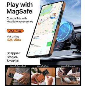 Capa fina, leve, com design empresarial e elegante, compatível com Samsung Galaxy S25 Ultra (2025). Possui suporte invisível ajustável entre 40°~120°, compatível com acessórios MagSafe, feita de couro PU premium com moldura de TPU antiderrapante, bordas elevadas para proteção da tela e câmera.Características